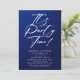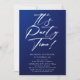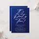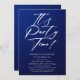 Es el Fiesta Time 40th 40th Birthday Party Simple Elegant Invitation Invite presenta un diseño minimalista con el texto "¡Es la hora del Fiesta!" en la tipografía moderna de escritura de caligrafía blanca y personalizado debajo con el texto personalizado en un fondo azul. Se pueden cambiar el estilo y el color del tipo de letra del texto editable. Diseñado por © Evco Studio www.zazzle.com/store/evcostudio