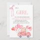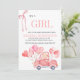 Esta encantadora ducha de bebé celebra la llegada de una niña con un diseño cálido y caprichoso. La frase "IT'S A CHICA" ocupa el centro del escenario con un elegante y suave tipo de letra coralina, emparejada con un ilustracion decorativo de cinta para darle un toque de sofisticación. A continuación, los detalles personalizados de los eventos se organizan cuidadosamente en una fuente elegante para facilitar su lectura. El fondo muestra un adorable ilustracion de un auto rojo vintage que lleva un bulto de globos rosa en forma de corazón, que evoca alegría y festividad. El diseño general combina calidez, elegancia y alegría, lo que lo hace perfecto para una celebración especial.