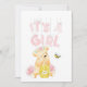 Tipografía adorable, "Es un Chica" diseño de ducha de bebé con un lindo oso de peluche chica con un barril de miel mirando una linda abeja. La divertida tipografía con letras rosas está colgada en la parte superior con lindas cuerdas y se desliza. Flores rosas y plantillas para crear tu propia invitación en la parte posterior.