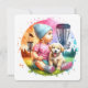 Una ducha de chica dulce con un tema de golf en disco. ilustracion de bonito de una niña con un cachorro sentado a su lado en un campo de golf de disco en un estilo acuarela, se usan colores rosados, naranjas, morados y verdes.