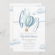 Esta encantadora invitación a la ducha de bebé incluye un bonito globo de aire caliente azul y nubes, junto con una elegante tipografía de guiones. Con el código QR del Registro y los detalles del evento al revés. Diseñado por Thisisnotme©