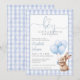 Esta encantadora invitación para baby shower presenta un tierno conejito bebé sosteniendo globos y un fondo de cuadros azules. Diseñado por Thisisnotme©