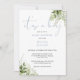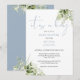 Una elegante y sofisticada invitación para baby shower con tipografía elegante en azul polvoriento y hermoso follaje de vegetación botánica. Diseñado por Thisisnotme©