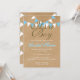 "ES UN NIÑO" TARJETA DE INVITACIÓN RÚSTICA PARA BABY SHOWER DE BIENVENIDA AL BEBÉ. Esta bonita tarjeta de invitación para baby shower rústica presenta banderines en azul bebé y blanco sobre un fondo estilo papel kraft, y una hermosa caligrafía en guión dorado falso con el nombre de la nueva mamá resaltado en letra azul bebé con sombra blanca. El reverso presenta filas de banderines en azul bebé y blanco sobre un fondo estilo papel kraft. Diseñado por Pure Piglet en www.zazzle.com/purepiglet*.