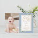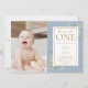 Una elegante invitación fotográfica de la celebración de 1er cumpleaños con la foto especial del niño de cumpleaños, hojas de color agua en un fondo azul y elegante tipografía de oro. Diseñado por Thisisnotme©