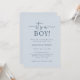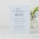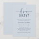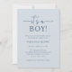 Prepárate para dar la bienvenida a tu pequeño al mundo con esta Invitación de ducha de bebé niño que presenta texto azul marino sobre un fondo azul polvoriento claro con un elegante guión de caligrafía, perfecto para establecer el tono para una celebración sofisticada.