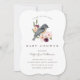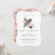 Hermosa invitación de ducha de bebé estilo bohemio con flores de acuarela y vegetación y un pajarito. Nuestro diseño presenta nuestras flores de acuarela pintadas a mano y un pajarito de acuarela con una hoja de ramita en el pico. La parte posterior presenta nuestro patrón floral de acuarela dibujado a mano que complementa hermosamente la obra de arte del frente. Todas las ilustraciones son obras de arte originales dibujadas a mano por Moodthology.