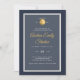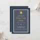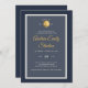 Una falsa grabado en relieve invitación para una graduación de triple marco para un graduado de facultades de Derecho que es simple pero sofisticado, atemporal y elegante. Tenga en cuenta que el relieve en los marcos se crea a través de una imagen y que no aparecerá ningún relieve real en la tarjeta. En la parte superior, un estilizado ilustracion vectorial de la escala de la justicia muestra el año de graduación. Un falso efecto dorado en la escala de la justicia y en el color de la caligrafía eleva esta moderna y elegante invitación clásica a la fiesta de graduación que también tiene un fondo marino. Personalizar cada línea de texto. Marina, blanco y oro.