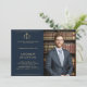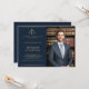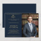 Celebra tu graduación de la Facultad de Derecho - o tú mismo - con esta elegante y clásica invitación fotográfica a la facultad de Derecho con un tema blanco y dorado. Reemplace la escala de justicia con el logotipo de su escuela o déjela como está. El diseño de la tipografía contemporánea se eleva por los tonos dorados y la disposición minimalista. Dos líneas doradas (¡efecto digital!) sugieren un marco moderno y minimalista para la foto. Personalizar cada línea de texto. Marina y oro falso.