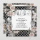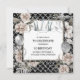 Un bonito marco cuadrado está bordeado de delicados rosas acuáticos en tonos blancos pálidos y rosados polvorientos, que forman un borde alrededor de plantillas negras y unas sucesiones de purpurinas chispeantes falsas; globos y cadenas de joyas colocadas sobre un fondo de sirena en blanco y negro. Los rincones tienen delicados giros floridos de plata falsa y una falsa corona de plata / tiara con incrustaciones de joyas de diamante aparece a lo largo del borde superior. Delicadas hojas de helecho aportan suavidad a este elegante y moda aspecto de moda francesa. Ideal para una ducha de novia; fiesta de cumpleaños o celebración especial del aniversario de un boda.
