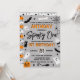 Estas divertidas y elegantes invitaciones son perfectas para cualquier persona que celebre su primer cumpleaños en Halloween. El diseño presenta todo espeluznante, desde un gato negro con murciélagos voladores hasta la telaraña de una araña, los fantasmas, un palo de brujas, cráneo y hueso, una bola de vidrio mágica y una calabaza de linternas de jack-o-lantern, todo con colores negros, blancos, grises y naranjas. La redacción de la plantilla es fácil de personalizar y los invitados de su fiesta se asustarán cuando reciban estas invitaciones por correo.