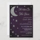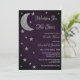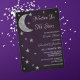 Escrito en la ducha de novia de las estrellas. Luna plateada y estrellas en un fondo morado oscuro de medianoche