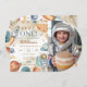 Invitación a la foto del primer cumpleaños del espacio. ¡Diviértete con esta invitación al primer cumpleaños del espacio! Perfecto para el primer viaje de su pequeño astronauta por el sol, este diseño editable cuenta con cohetes, planetas, estrellas y un fondo de galaxia. Personalice los detalles de su fiesta en minutos, ideal para celebrar su primer cumpleaños con temática espacial. ¡Envíe digitalmente o imprima en casa para una invitación fuera de este mundo!