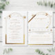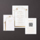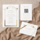 Las invitaciones a la Boda Espacial de la Estrella de Sol de la Luna de Oro Blanco Celestial presentan sol, luna y estrellas con un marco dorado sobre un fondo blanco. Adentro está tu información de invitación de boda personalizada. Personalice editando el texto en los cuadros de texto. Diseñado por ©Evco Studio www.zazzle.com/store/evcostudio