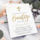 Moderno y elegante niño Bautizo Invitación con fondo blanco y dorado , elegante cruz de oro, escritura tipográfica Baptismo en letras de moda. Para editar esta plantilla, haga clic en personalizar más adelante.