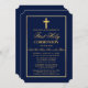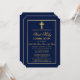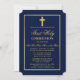 Elegante invitación a la comunidad azul de la marina y oro por primera vez sagrada con cruz. Marco dorado. Cruz de Oro.
