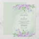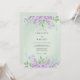 Este diseño presenta un suave fondo verde menta adornado con delicadas lilas de acuarela y pequeñas flores azules. La estética etérea crea una atmósfera serena perfecta para un evento romántico de primavera. Hojas y tallos verdes añaden un toque botánico a los bordes superior e inferior, resaltando el centro con belleza natural.