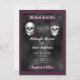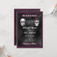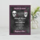 Invitación de boda oscura y hermosa con la frase Hasta que la Muerte nos Separe, calaveras de esqueletos con rosas y un fondo negro sombrío sobre fondo púrpura. La parte trasera de la invitación tiene calaveras juntas. Perfecto para una boda gótica o de Halloween.