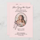 Este diseño de moda presenta un lazo rosa con estética coqueta y la foto de tu novia. Personaliza con el nombre de la novia, foto, y la fecha y/o ubicación.