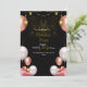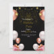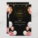 Esta invitación a la fiesta de cumpleaños tiene un diseño lujoso y festivo, perfecto para una celebración nocturna. El fondo negro oscuro crea un contraste dramático con los acentos rosa de oro, blanco y rosa. Los elementos decorativos son: