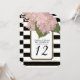 ¡Una forma tan económica de agregar brillo y glamour al decorado de la mesa de recepción! Estas tarjetas de número de mesa se pueden enmarcar, colocar en un soporte o utilizar de muchas maneras para dirigir a sus invitados a su asiento en la mesa para su recepción de boda formal, ducha de novia o evento comercial formal. Simplemente cambie el número de mesa para cada uno y colóquelo en su carrito de compras. Este diseño tiene un diseño floral pintado a mano con flores de hortensia rosadas. Estas flores crecieron en los jardines de Audrey Jeanne y se recogieron frescas para pintar del natural. Un fondo de rayas anchas negras y blancas en negrita se combina con un marco de estilo art déco con esquinas dentadas que se delinea con un brillo dorado falso. Derechos de autor de arte y diseño gráfico, Audrey Jeanne Roberts, todos los
