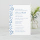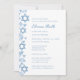 Honre su hito con esta elegante invitación azul de Mitzvah que incluye un moderno texto de la frontera de la Estrella de David y un texto de personalizable completo. Con un diseño geométrico suave y un diseño limpio, es perfecto para una celebración Bar o Bat Mitzvah. Ideal para familias que buscan una invitación refinada y minimalista que combina tradición con estilo contemporáneo. Personalice el nombre, la fecha, la ubicación y los detalles del servicio.