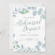 Un elegante ensayo de bodas para la cena, que complementaría una boda de invierno. Este diseño presenta un marco de hojas de eucaliptos azules polvorientos a color de agua con "cena de ensayo" con polvorientas letras azules y modernas de caligrafía. Personalice con detalles de su evento en letra gris. El reverso está en azul polvoriento sólido.
