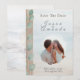 Anuncia tu boda con una elegante elegancia costera sin esfuerzo. Esta tarjeta de "Save the Date" presenta una suave costa de acuarela, un acento de madera flotante cálido y una ilustración vertical de eucalipto que aporta serenidad natural a tu diseño. Tu foto está enmarcada dentro de un círculo sutil pintado a mano, creando un punto focal romántico que se siente aireado, moderno y atemporal.