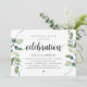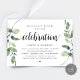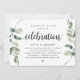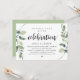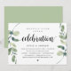 Tarjeta de invitación temática de eucalipto verde rústico moderno, escritura negra (con título de tarjeta: Celebración Feliz para Siempre). Es perfecta para su recepción de boda íntima / fiesta de celebración post-boda. Agregue sus detalles en fuente / letra negra a juego.