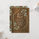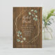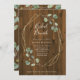 Esta rústica y moderna invitación al brunch de la ducha de matrimonio incluye hojas de eucalipto de color sencillo y romántico y follaje en un falso marco geométrico dorado. El fondo es de madera marrón rústica.
