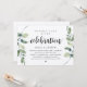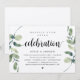 Tarjeta de invitación temática de eucalipto verde rústico moderno, guión negro, kraft (con título de tarjeta: Celebración Feliz para Siempre). Es perfecta para su recepción de boda fugada / fiesta de celebración posterior a la boda. Agregue sus detalles en fuente / letra negra coincidente.