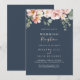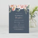 Esta invitación a la celebración de una boda floral en el jardín de eucaliptos es perfecta para un fiesta posventa moderno. El diseño se compone de flores rosas rosas rosas, de color rosa, con hojas de eucalipto en un fondo azul marino oscuro. Las tarjetas RSVP se venden por separado, o puede ver los detalles de RSVP en la parte posterior o inferior de la tarjeta.
