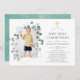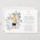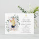 Invitación a la primera comunión de la acuarela de moda eucalipto plata dólar con marco geométrico dorado. Se recomienda una foto en forma de retrato.