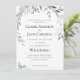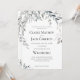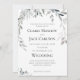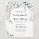 Una sutil invitación a una boda blanca con una delicada acuarela de berenjenas de eucalipto plateado con un tradicional funda serif superior anuncia a tu boda.