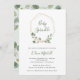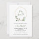 Esta moderna y elegante invitación a la rociada de bebés cuenta con una corona de hojas de eucalipto de color verde y acuarela y un marco geométrico de oro falso sobre un fondo blanco. Es neutral en cuanto a género, tan perfecto para un chica o un niño.