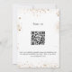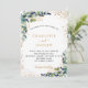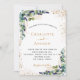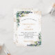 Un fondo blanco decorado con vegetación eucaliptos y follaje dorado. Personalice y agregue sus nombres y detalles del boda. Letras de color negro y dorado. Atrás: agrega tu weburl a tu sitio web boda para obtener información sobre RSVP o detalles.