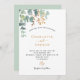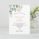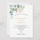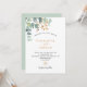 Un fondo blanco moda. Decorada con hojas de eucaliptos de color verde acuático, brotes, vegetación y una falsa primavera dorada. Personalice y agregue sus nombres y detalles del boda. Cartas negras. Color de fondo verde.