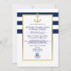 Elegantes cartas de invitación a rayas azules y blancas de la marina. El ancla dorada con marco de Relieve metalizado dorado añade ese toque extra de clase. Añade tus plantillas personalizadas LOGO de evento/empresa para que puedas DIY fácilmente y añadir/editar con tu propia información. Perfecto para cualquier evento náutico.
