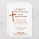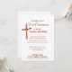 Una invitación de primera comunión con cruz de palma en tipografía dorada chic es un anuncio perfecto para la celebración de su hijo. La obra de arte presenta un diseño simple de cruz de palma hecha a mano, del Domingo de Ramos durante las celebraciones de la Pascua, sobre un fondo blanco. Un diseño clásico minimalista dorado y blanco con un toque rústico bohemio. Personalizable para adaptarse a su estilo y detalles del evento. El diseño elegante es adecuado para cualquier evento religioso, incluyendo primera comunión, bautizo, bautismo o confirmación.