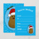 Adorable y divertida patata de dibujos animados marrón que lleva un gorro de Santa rojo y blanco. La patata está en un estilo de arte de dibujos animados y coloreada marrón, tiene brazos y dedos de palito y una gran sonrisa feliz con puntos para los ojos. El gorro de Santa en su cabeza es rojo con un borde blanco y un pompón blanco colgando. Está dentro de una forma ovalada azul claro con un marco azul oscuro y dos hojas de acebo verdes con dos bayas rojas en la parte superior del óvalo. El color de fondo es un azul claro brillante con copos de nieve blancos flotando para dar un ambiente festivo a estas lindas invitaciones de temporada.