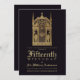 Esta vintage invitación en negro y oro a una fiesta de cumpleaños temática medieval tiene en la parte superior una puerta de castillo medieval entre dos torres góticas, custodiadas por dos caballeros armados, con halberds. Sobre ellos hay otros dos caballeros armados, a caballo, con banderas, y en el centro, encima de la puerta, hay un león heráldico. El texto está escrito en letras doradas bajo el ilustracion. El nombre y la edad están escritos con fuentes góticas de estilo medieval. El fondo es negro. La imagen vintage en negro y oro con decoración gótica proviene de una portada de un libro antiguo, "Marmion, a Tale of Flodden Field", de Sir Walter Scott, de 1839, ahora de dominio público.