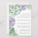 Invitación a bodas botánicas con suculentos de color verde y púrpura en la parte superior e izquierda y tus detalles en un suave tipo de letra gris. En la parte trasera hay un lavabo de acuarela verde. Los suculentos añaden un gran elemento natural al diseño. Estas invitaciones son perfectas para un boda del desierto en primavera o verano.