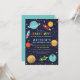 Celebra el día especial de tu hijo con estas adorables invitaciones a fiestas de cumpleaños con temática espacial. Este diseño presenta los detalles de su fiesta personalizado en una tipografía colorida y moderna y un marco de planetas, estrellas, cohetes y más contra un cielo azul marino. Estas tarjetas se revierten a un fondo azul. Edite el texto de los cuadros de plantilla en personalizar.