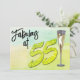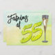Este diseño "Fabulous at 55" de cumpleaños, con una fotografía de vidrio de champán en la parte delantera y detalles fiestas en la parte trasera sobre un fondo de color verde pastel. Rellene los campos de texto de la plantilla con su información, elimine texto o edite utilizando la herramienta de diseño para seleccionar un estilo de fuente, tamaño y color que prefiera.