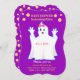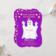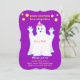 Bebé ducha encantadora invitación fantasma. Hay un patrón de puntos de polka dorados en el fondo púrpura real en el reverso. Todos los textos y números están listos para ser personalizados.