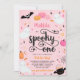 Una invitación de fiesta de primer cumpleaños Spooky One pink Halloween, perfecta para la celebración de primer cumpleaños de tu pequeño. Con adorables fantasmas espeluznantes y ilustraciones de calabaza.