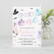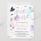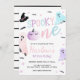 ¡Una fiesta de halloween no tan espeluznante! Pastel rosa, púrpura y naranja Spooky Un fantasma Halloween 1er cumpleaños invitación con fondo de rayas blancas y negras.