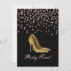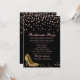 Invitación a una fiesta de soltería Glam hecha en negro, con gráficos de confeti color rosa y dorado y estilete dorado a tacones altos. Personalice el texto del personalizado rosa para que se ajuste a sus necesidades.