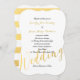 Elegante Glamour de Relieve metalizado dorado Faux | Elegantes invitaciones de bodas. Diseño de Elke Clarke©. Otros estilos y colores disponibles en nuestra tienda www.zazzle.com/monogramgallery. Un sencillo guión de escritura a mano con la palabra "boda" adorna este clásico pero moderno estilo de invitación a la boda. El texto es totalmente personalizable. El patrón de rayas doradas y blancas en la parte posterior se puede eliminar o se puede solicitar un color o patrón diferente. Viene con sobre blanco en blanco. Relieve metalizado dorado es un efecto fotográfico impreso.