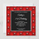 Crea tu propia y elegante invitación al estilo cuadrado de celebración de cumpleaños de aniversario para ella. El fondo decorativo de la imagen gráfica del arte digital presenta un brillante diseño de imitación roja brillante de diamante tufado. En el centro de la parte delantera hay una plaza negra con un borde oscuro y plateado, la información de la invitación personalizada. Mueva o elimine el gráfico de brillo blanco falso. Personalizar los elegantes estilos de fuente, color y tamaño. Fabulosa invitación de cumpleaños para tu mejor amigo.